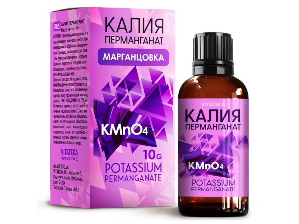 | Zloženie: | Manganistan draselný (KMnO₄). |