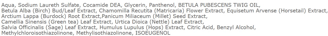 | Zloženie: | Voda, sodium laureth sulfate, kokamid DEA, glycerín, pantenol, olej z vetvičiek Betula pubescens, extrakt z púčikov/listov brezy bielej, extrakt z kvetov rumančeka kamilkového, extrakt z prasličky roľnej, extrakt z koreňa lopúcha väčšieho, extrakt zo semien prosa siateho, extrakt z listov čajovníka čínskeho (zelený čaj), extrakt z listov žihľavy dvojdomej, extrakt z listov šalvie lekárskej, extrakt z chmeľu, kyselina citrónová, benzylalkohol, methylchloroisothiazolinone, methylisothiazolinone, isoeugenol. |
