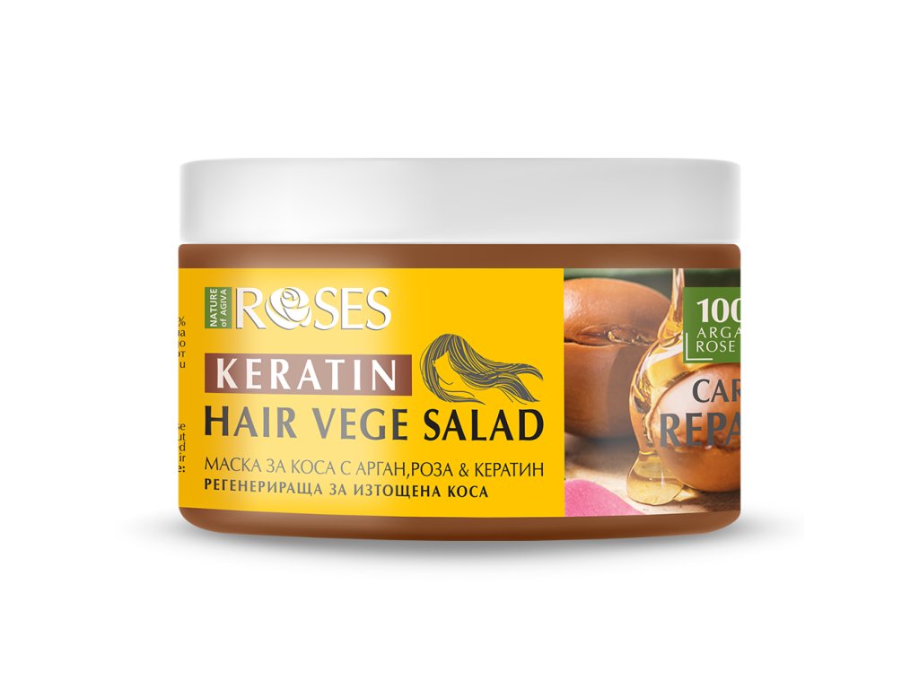 ROSES VEGE SALAD regeneračná maska na vlasy je intenzívna výživa pre suché, poškodené a oslabené vlasy. Bohaté zloženie s ružovým a arganovým olejom a pridaným keratínom obnovuje vlasové vlákna, posilňuje ich štruktúru a navracia vlasom zdravý vzhľad.